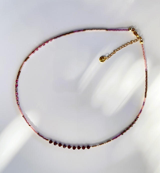 【 ビーズネックレス ガーネット/ピンクトルマリン/スモーキークオーツ】 美しい天然石とガラスビーズを使用したネックレスです。 ガーネット/ピンクトルマリン/スモーキークオーツと ガラスビーズの色合いのバランスが素敵な1品です。 ガーネットは3mmその他天然石・ビーズは 2mm程度のビーズで作成されており、 とても華奢なネックレスでありながら 存在感のあるデザインとなっております。 着ける方の魅力を引き出すお手伝いができる アクセサリーでありたいと願っております。 サイズ・材料 ・ビーズ部分:約39cm/アジャスター部分:約5㎝ ※使用するビーズの中には メッキ加工のあるビーズもございます。 金属アレルギーの心配のある方は 慎重にご検討ください。 ・アジャスター/金具 :ステンレス ・天然石:ガーネット/ピンクトルマリン/スモーキークオーツ ・ガーネット ガーネットは、持ち主の努力が実を結ぶよう 手助けするといわれています。 目標に向かって一歩ずつ進む勇気をくれ、 難しい課題に直面したときも、 秘めた力を引き出し、乗り越えるためのエネルギーを 与えてくれるといわれます。 また、日々の生活で疲れを感じたり、心身が重く感じられるとき、 新たな活力を吹き込み生命力を高める効果があるといわれています。 ・ピンクトルマリン ピンクトルマリンは「愛の石」とも呼ばれており、 ローズクォーツなどのピンク系の宝石同様に 「愛」にまつわるパワーをもつと考えられています。 良縁を引き寄せるとされる他、気持ちを前向きにして、 チャンスを掴む手助けをしてくれるともいわれています。 恋愛や仕事などでそっと背中を押してほしい時に 身に着けたい宝石です。 ・スモーキークオーツ スモーキークォーツには「グラウンディング」と よばれる効果があるといわれています。 「グラウンディング」とは、自分の精神の中心と地球を結びつけ、 精神的なエネルギーと肉体的なバランスを よりよい状態へ導くことです。心と身体のバランスがとれて 自己調律ができている状態にしつつ、 それを軸に正しく健全な思考力を獲得することができると いわれています。 ※こちらの商品は1点1点手作りの商品につき 現物の出荷となります。 ※天然素材を使用しているため、 色合いや模様に個体差があります。 注意事項 商品写真はお使いのモニター設定や照明等により、 実際の商品と色味が異なる場合がございます。 天然石の特性上、傷や欠けがある場合もございますが、 これも魅力の一部としてお楽しみいただければ幸いです。 また、長時間の直射日光を避けてご使用ください。