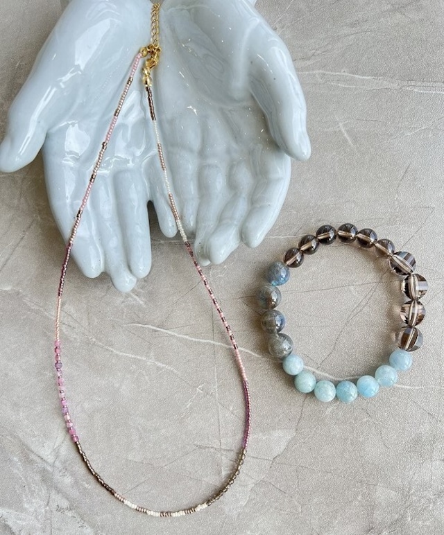 【2/20販売スタート ビーズネックレス ピンクトルマリン/スモーキークオーツ】 美しい天然石とガラスビーズを使用したネックレスです。 ピンクトルマリン/スモーキークオーツと ガラスビーズの色合いのバランスが素敵な1品です。 2mm程度のビーズで作成されており、 とても華奢なネックレスでありながら 存在感のあるデザインとなっております。 着ける方の魅力を引き出すお手伝いができる アクセサリーでありたいと願っております。 サイズ・材料 ・ビーズ部分:約41cm/アジャスター部分:約5㎝ ※使用するビーズの中には メッキ加工のあるビーズもございます。 金属アレルギーの心配のある方は 慎重にご検討ください。 ・アジャスター/金具 :ステンレス ・天然石:ピンクトルマリン/スモーキークオーツ ・ピンクトルマリン ピンクトルマリンは「愛の石」とも呼ばれており、 ローズクォーツなどのピンク系の宝石同様に 「愛」にまつわるパワーをもつと考えられています。 良縁を引き寄せるとされる他、気持ちを前向きにして、 チャンスを掴む手助けをしてくれるともいわれています。 恋愛や仕事などでそっと背中を押してほしい時に 身に着けたい宝石です。 ・スモーキークオーツ スモーキークォーツには「グラウンディング」と よばれる効果があるといわれています。 「グラウンディング」とは、自分の精神の中心と地球を結びつけ、 精神的なエネルギーと肉体的なバランスを よりよい状態へ導くことです。心と身体のバランスがとれて 自己調律ができている状態にしつつ、 それを軸に正しく健全な思考力を獲得することができると いわれています。 ※こちらの商品は1点1点手作りの商品につき 現物の出荷となります。 ※天然素材を使用しているため、 色合いや模様に個体差があります。 注意事項 商品写真はお使いのモニター設定や照明等により、 実際の商品と色味が異なる場合がございます。 天然石の特性上、傷や欠けがある場合もございますが、 これも魅力の一部としてお楽しみいただければ幸いです。 また、長時間の直射日光を避けてご使用ください。